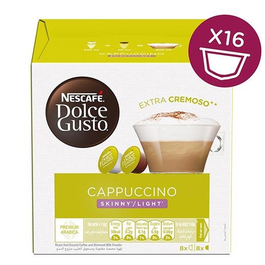 - The box contains 16 capsules designed for NESCAFE Dolce Gusto machines for you to prepare 8 cups of Skinny Cappuccino.